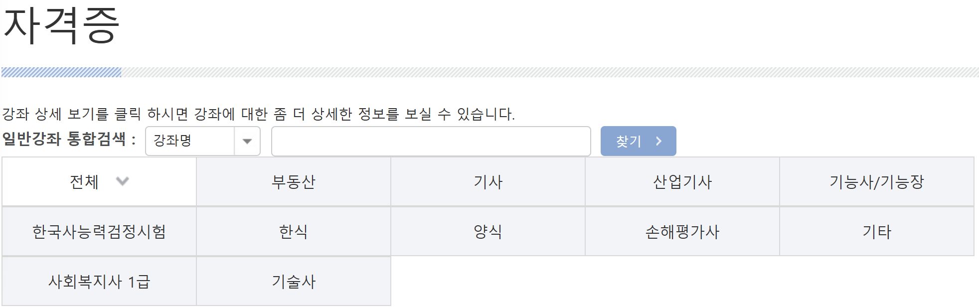 부동산 자격증부터 기술사 자격증까지 기타까지 포함하면 무려 11가지 분야의 강의를 보여주고 있는데요.